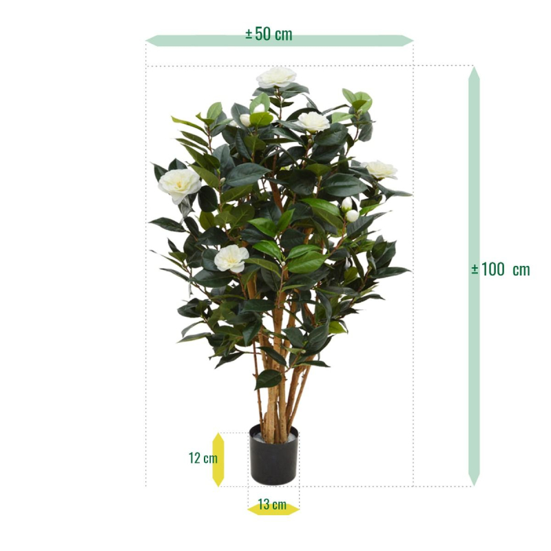 Deze Camelia kunstplant heeft een natuurlijke hoogte van ± 100 cm en een diameter van ± 50 cm. Wat deze plant zo realistisch maakt, zijn de echte houten stammetjes en de natuurgetrouwe vorm, waardoor hij identiek is aan een Camelia uit de tuin.