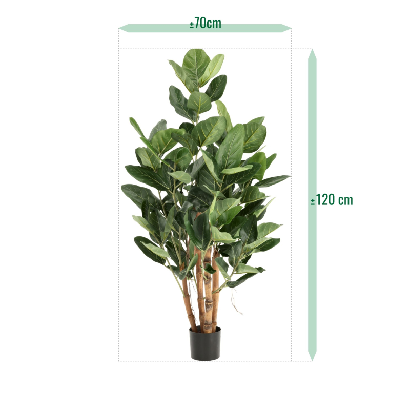 Met zijn royale hoogte van 120 cm en een volle breedte van 70 cm is deze luxe Ficus kunstplant deluxe een statige aanwezigheid in elke ruimte: