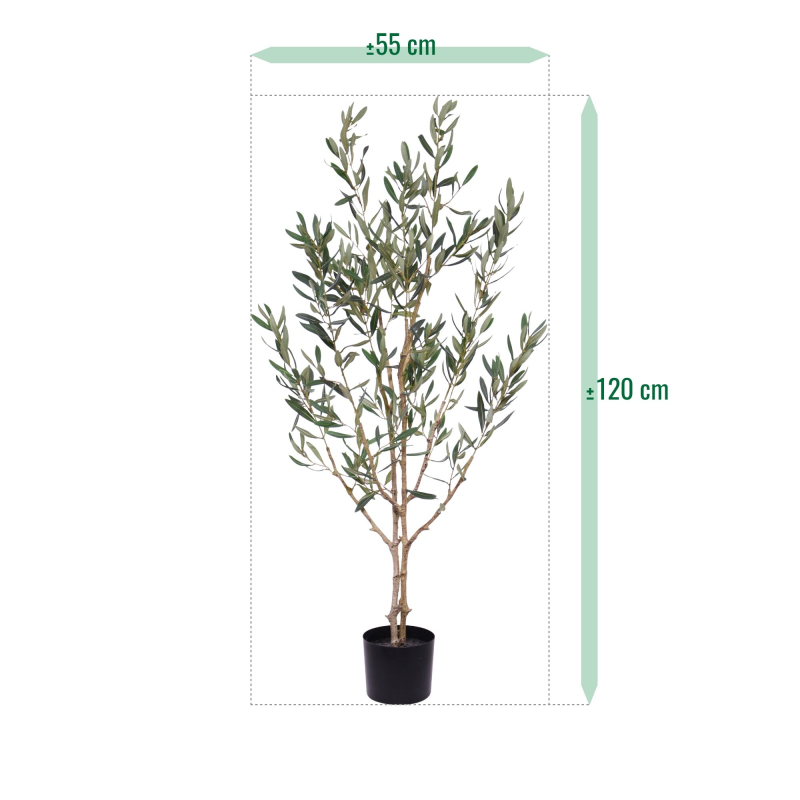 Dankzij het compacte formaat van 120 cm en een breedte van 55 cm is deze olijf kunstboom uitzonderlijk veelzijdig. Creëer direct sfeer in: