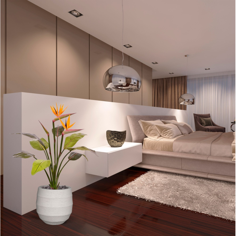 Gebruik de Strelitzia Bush 75 cm solo als opvallend element, of combineer de tak met andere kunstbloemen voor een levendig en kleurrijk kunstboeket.