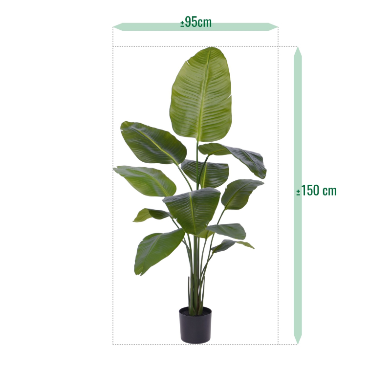 Met een majestueuze hoogte van circa 150 cm en een breedte van 95 cm, eist deze Nicolai direct de aandacht op. De plant is rijkelijk opgebouwd met meerdere stengels en heeft maar liefst 11 grote, kunstzijden bladeren, wat zorgt voor een buitengewoon volle en realistische uitstraling.