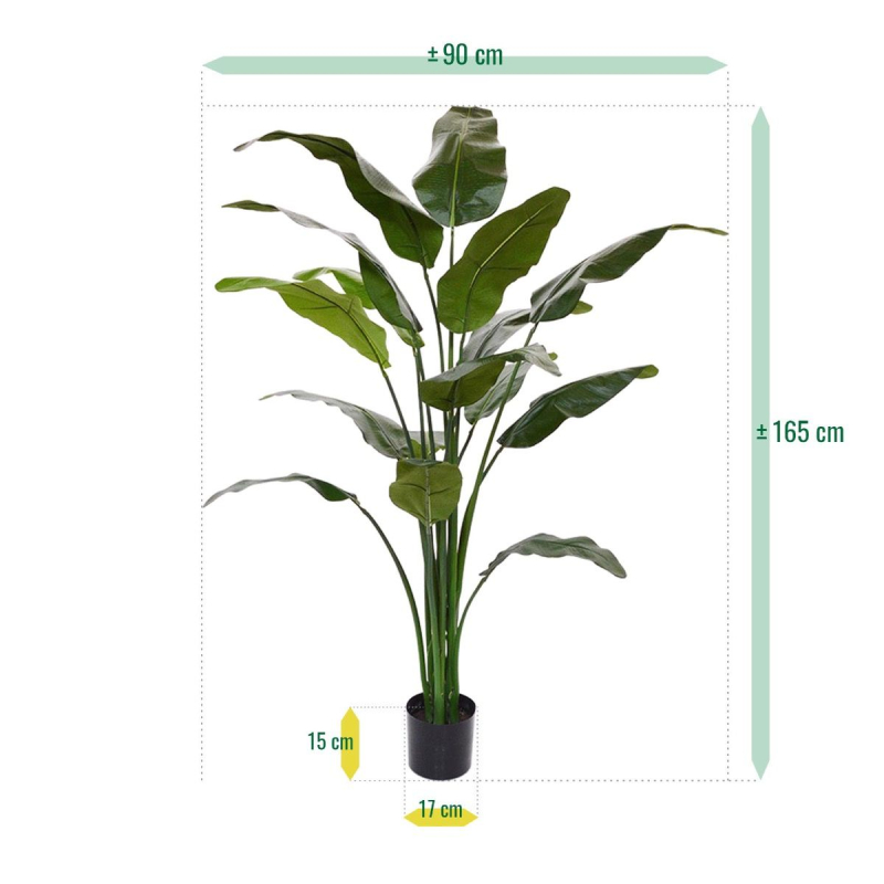 Ontdek de verfijnde allure van de Traveller Palm 165 cm, wereldwijd bekend als de Ravenala of Reizigers Palm ($Ravenala madagascariensis$). Deze grote kunstpalm, nauw verwant aan de Strelitzia, siert elke ruimte met zijn imposante en natuurgetrouwe uitstraling.